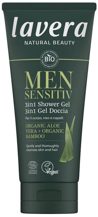 MEN Sensitive 3in1 dušo želė švelniai, tačiau veiksmingai valo kūną, veidą ir plaukus. Drėkinantis ekologiško alavijo ir ekologiško bambuko ekstraktų derinys suteikia gaivos pojūtį net ir jautriai odai bei plaukams.